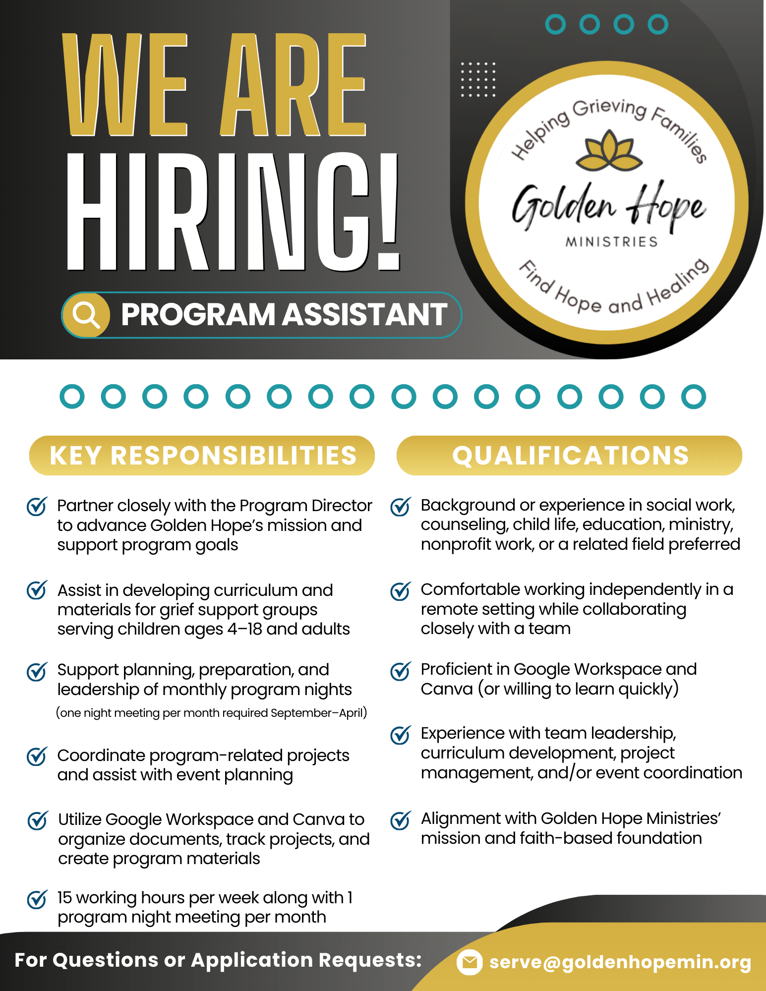 Golden Hope Ministries is seeking a compassionate, organized individual to help fill our Program Assistant role — click the button below to connect with our team and learn more about this opportunity!